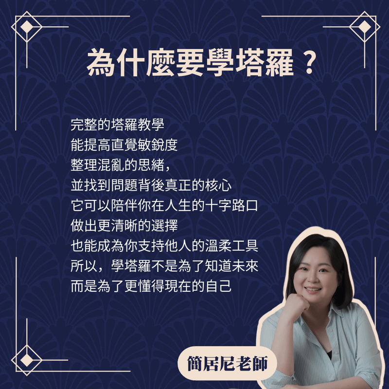 「居尼老師開設的《打開靈魂的門|塔羅初階與自我覺察課》,將帶您從牌義出發,逐步學會透過塔羅與自己對話。當生活出現疑惑時,牌面就像一面清澈的鏡子,映照出您的處境與心境。即使遇到挑戰,您也能藉由課程所學找到轉化的方法,讓每一次翻牌,都成為看見自己的契機。」
